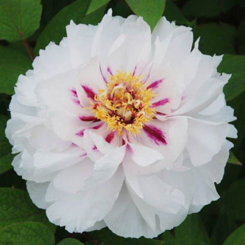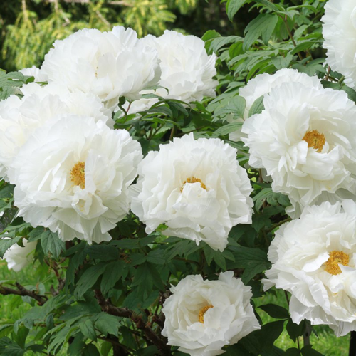 Дървовиден божур suffruticosa 'White' дава поразителни двойни бели цветове със златистожълти прашници и щрихи от кестеняви синини в сърцевината. Tой е силно ароматен, така че не забравяйте да го засадите на място, където може да се насладите на сладкия му аромат. Дървовидните божури са издръжливи на натоварване храсти със здрави дървесни стъбла, които позволяват на растението да оцелее през зимния сезон.